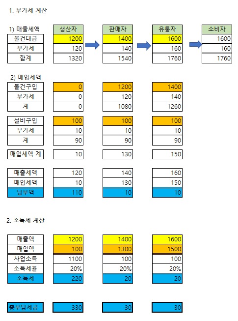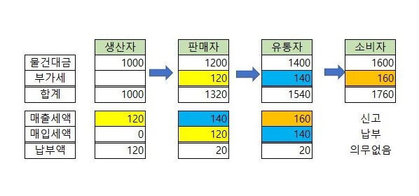 - 유통자는 국가에 20원의 세금을 납부하게 됩니다. (160원 - 140원 = 20원. 유통자의 부가가치)