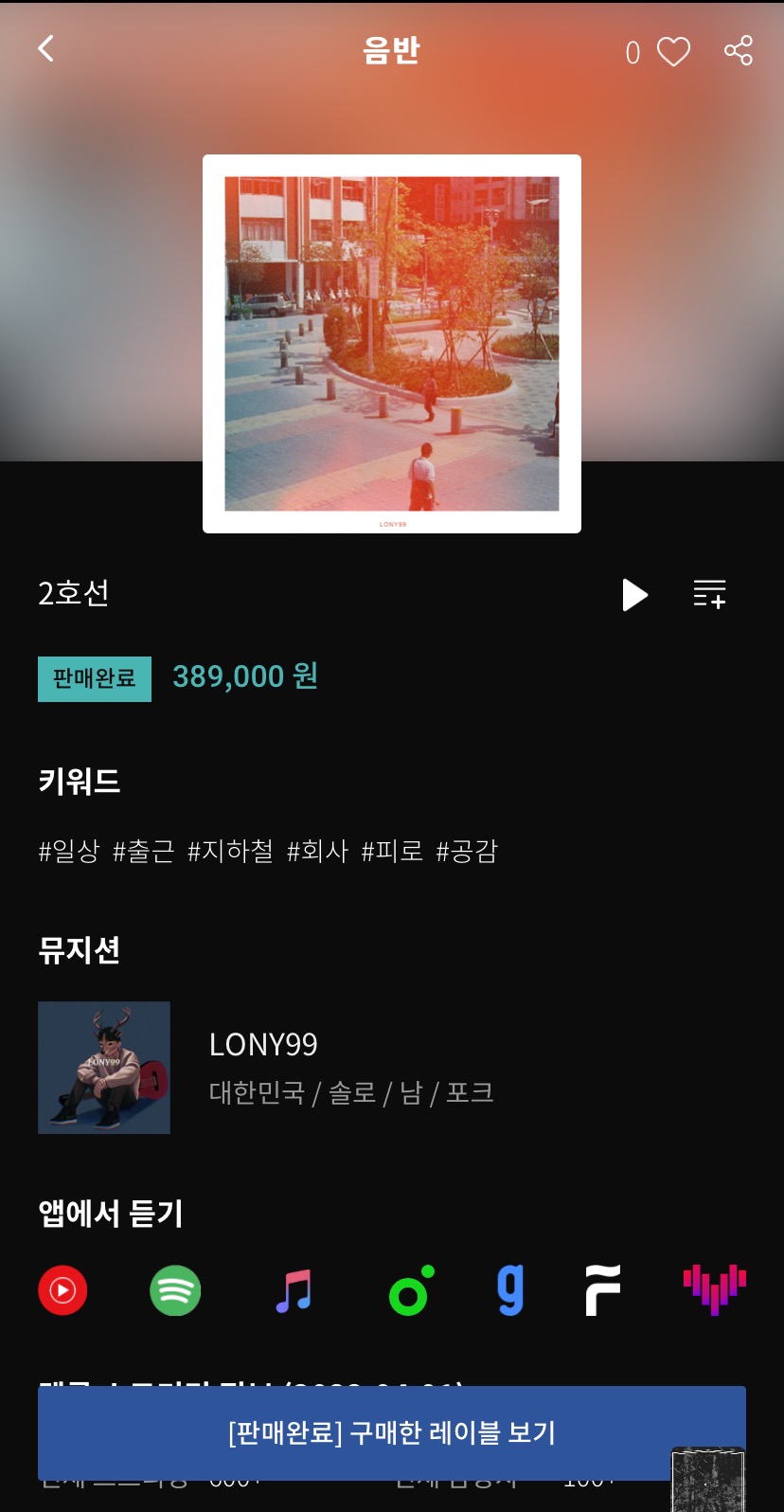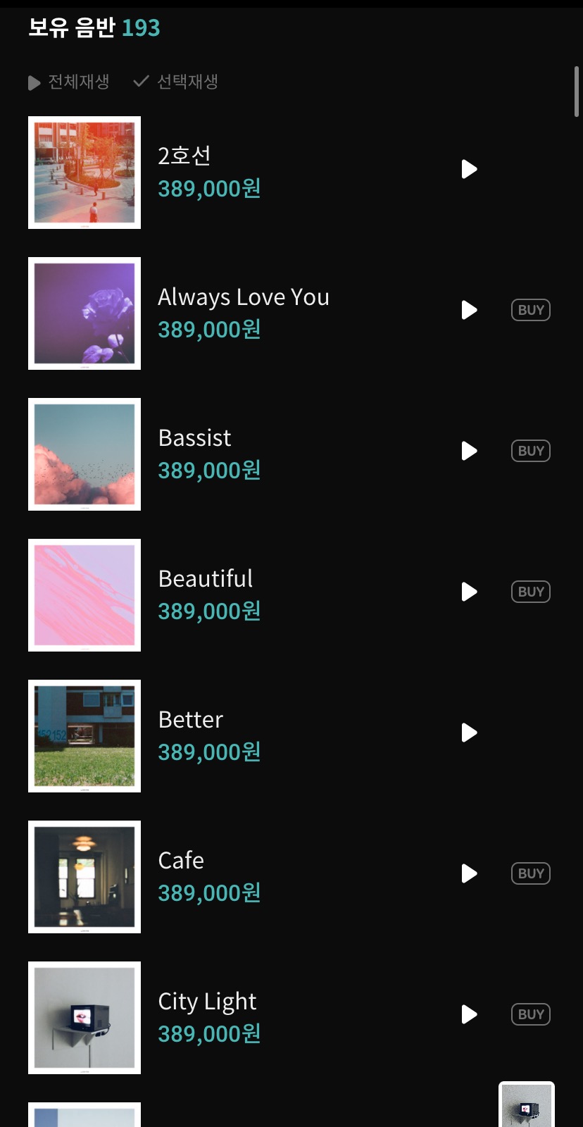 예시로 첨부한 가수는 193개의 음반을 보유 가격은 389,000원에 올려 놨네요 buy라고 써있는 것만 살 수 있습니다. buy 버튼이 없는건 판매 완료된 곡이에요