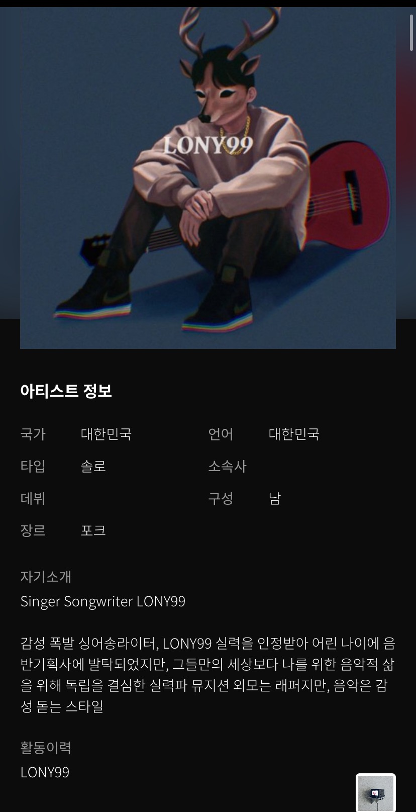 아티스트에 대한 간단한 정보가 있으며 자기소개글이 있습니다.