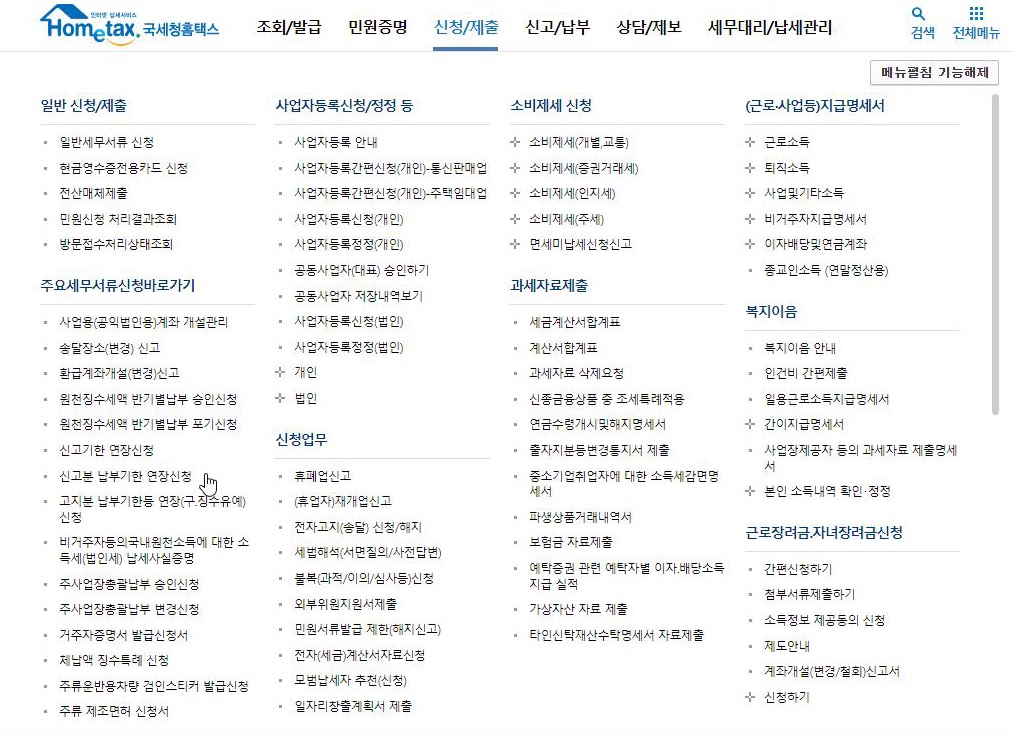 3) 왼쪽 아래 "주요세무서류신청바로가기" 목록에서 "신고분 납부기한 연장신청" 클릭