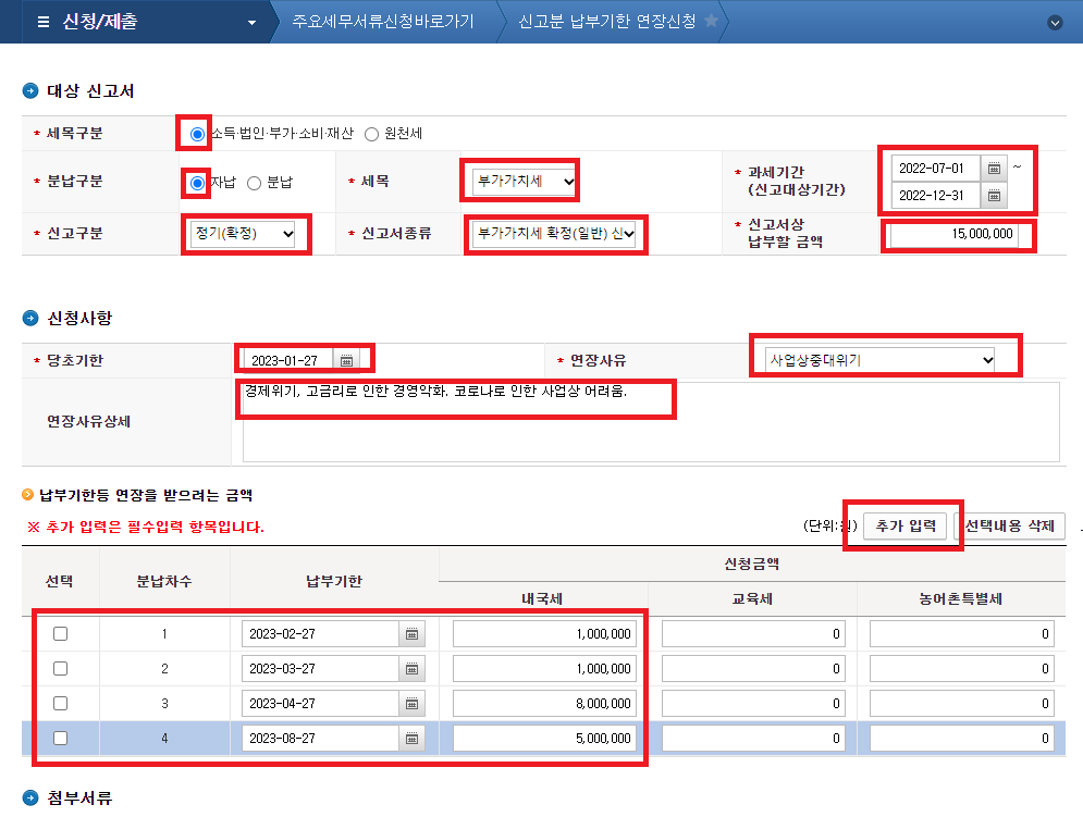 납부분납을 어떻게 할지 계획을 적는 것. 추가입력 버튼을 눌러서 납부기한을 적고 내국세에 부가가치세를 나눠서 낼 금액을 적으면 됨.