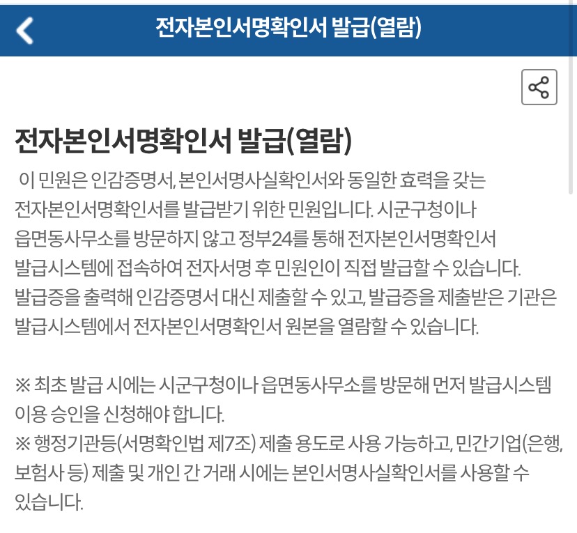 - 신분증과 함께 '전자본인서명사실확인서 발급시스템 이용 신청' 한다.
