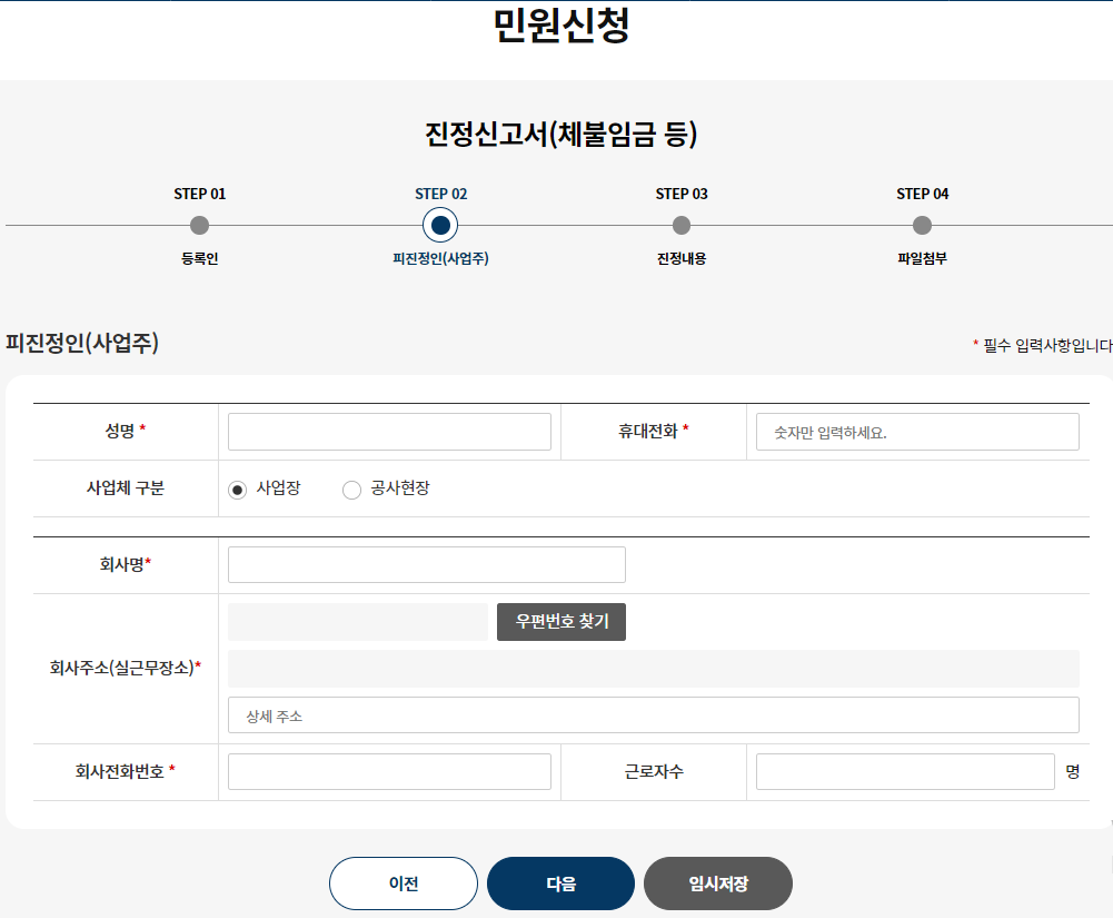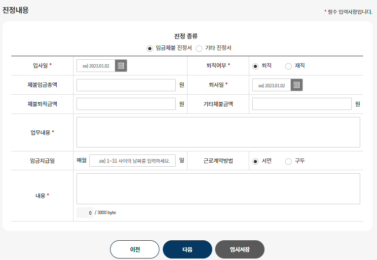 - 체불임금총액 : 못받은 금액 기재. 시간외수당등 계산이 어려울 수 있음. 정확하지 않다면 대략 기재해도 됨