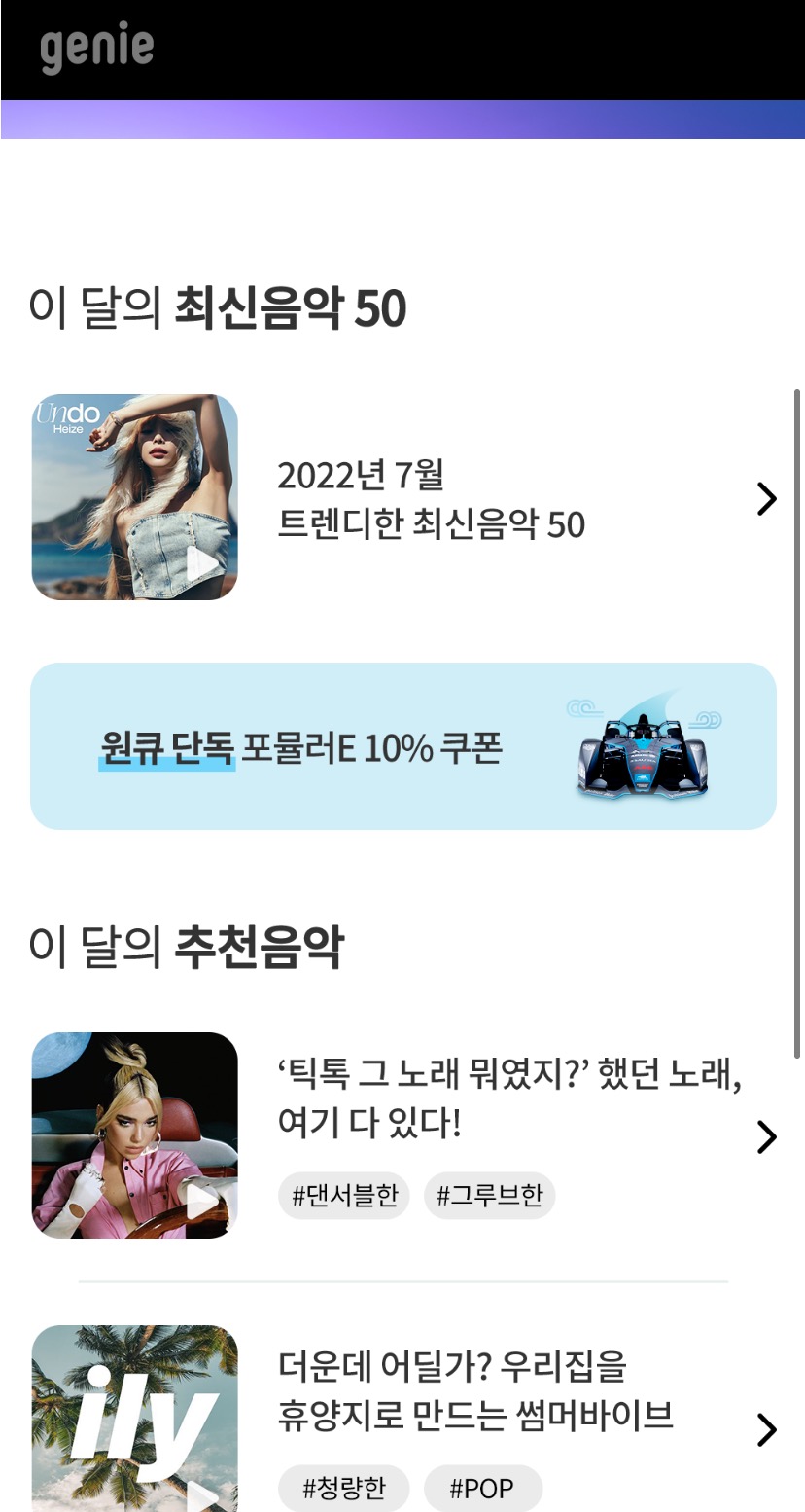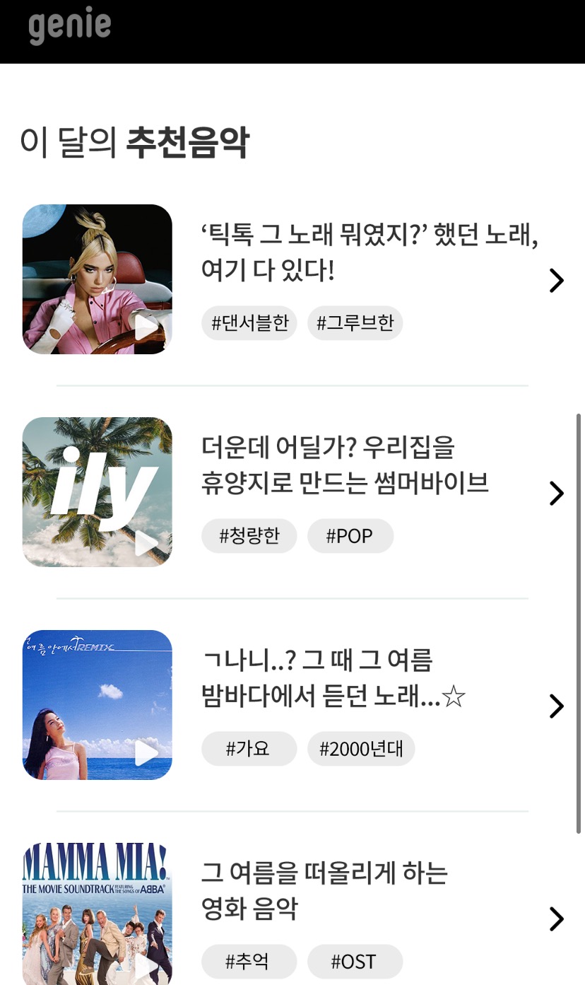 최신 유행곡과 테마별로 음악을 들을 수 있게 구성해 놓았습니다.