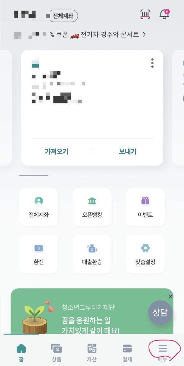 1) 하나원큐 어플을 열어서