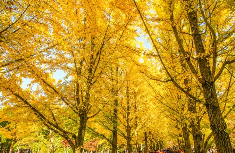 노란 은행나뭇잎이 바닥에 떨어져서 나무가 줄지어 서있는 마테세콰이아 길과 만나 장관을 연출합니다.