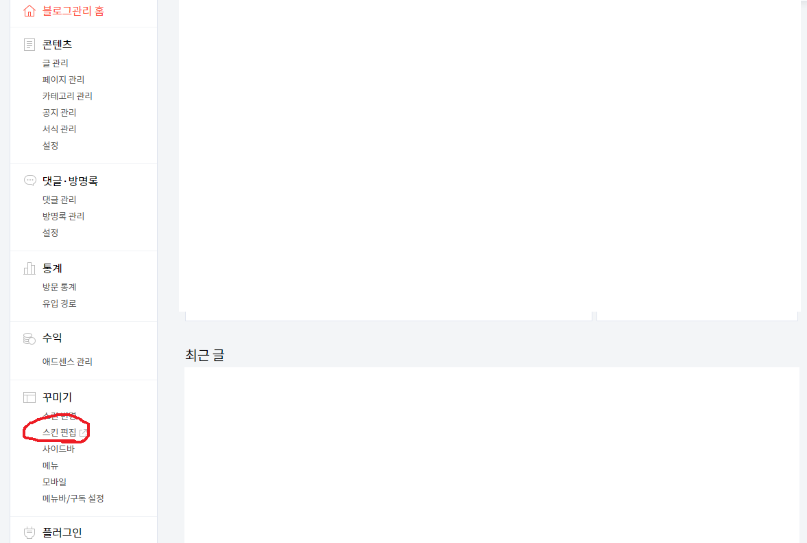 티스토리 관리화면에 들어가서 왼쪽에 보면 스킨편집이 있습니다.