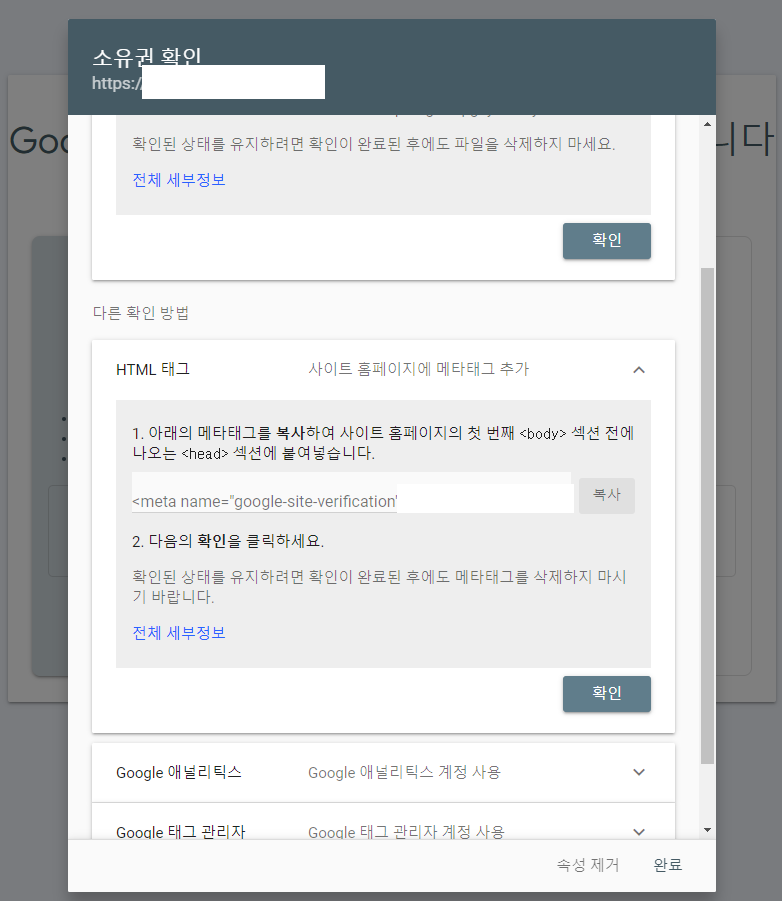 여기까지 완료했으면 서치콘솔 등록은 끝입니다.