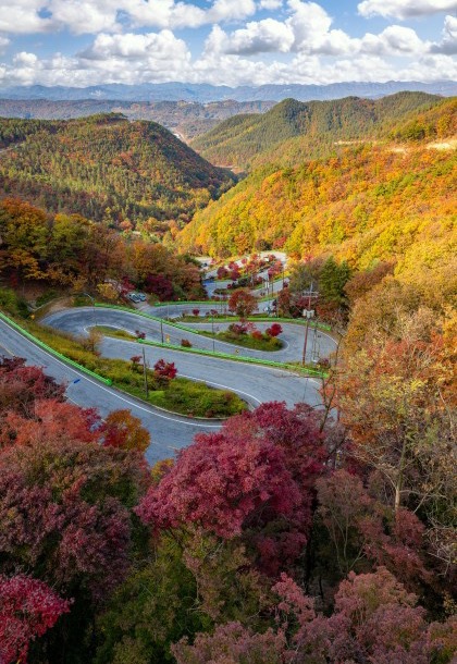 화려한 색감에 굽이진 길들이 조화를 이루고 붉은 색과 노란색의 색감이 길을 따라 아름답게 펼쳐져서,